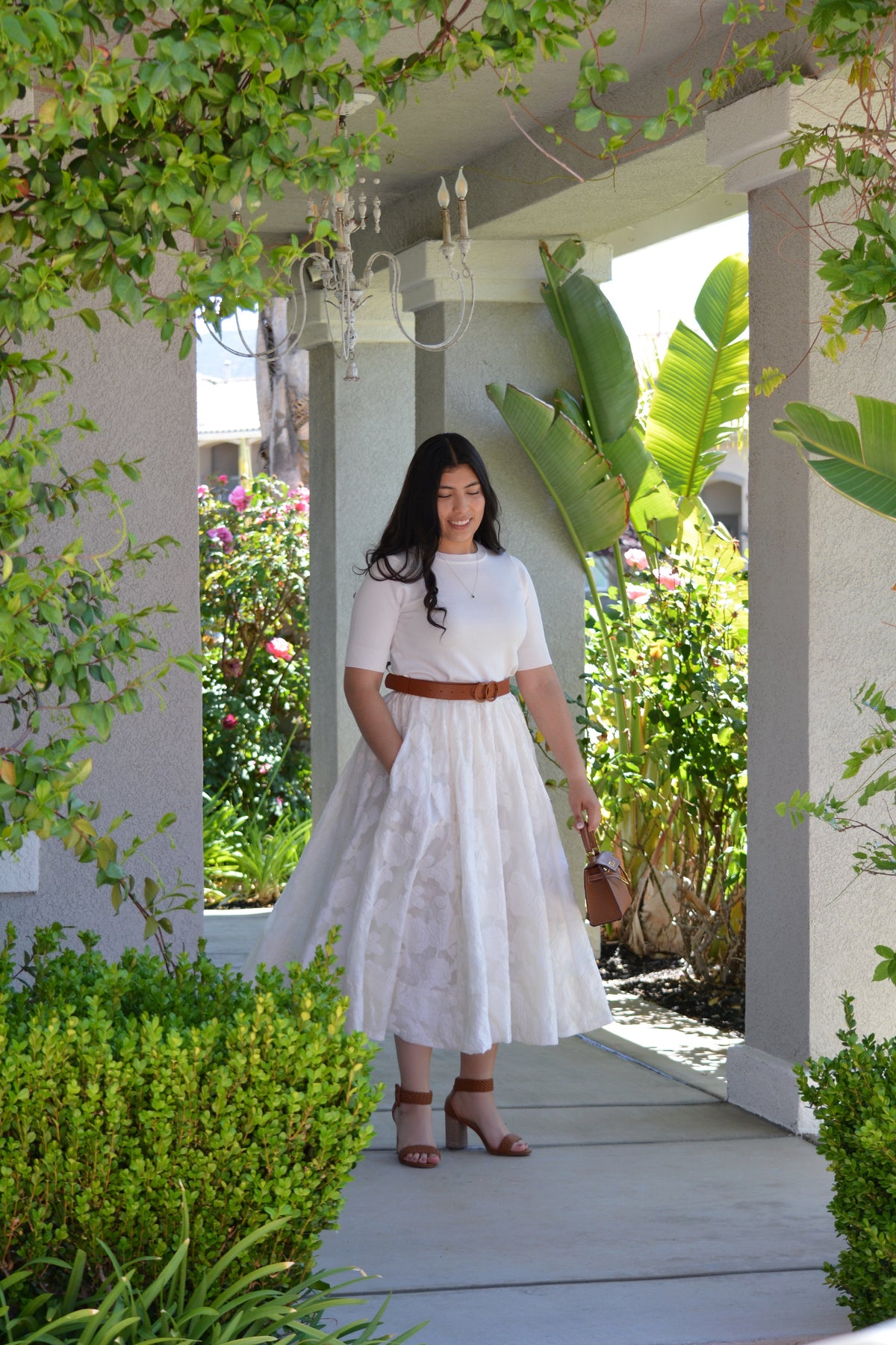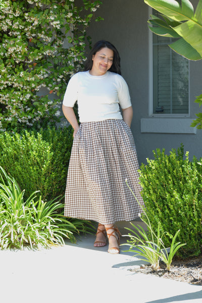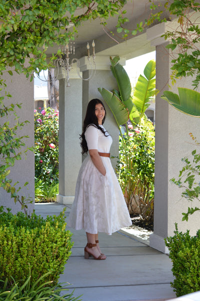 Modeled in medium paired with our Annie Jaquard Cream Skirt